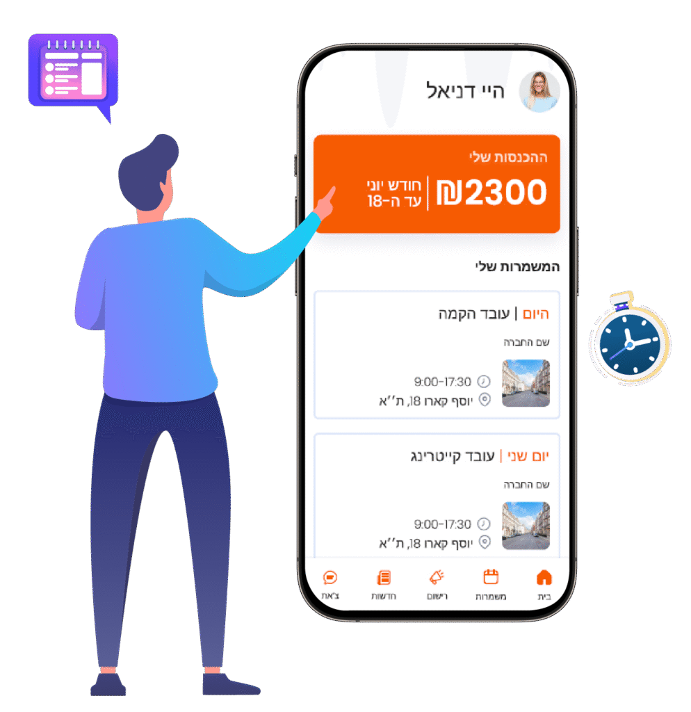 נכון מאוד! זה כולל ימי מחלה, ימי חופשה, והפקדות לפנסיה. אין צורך לדאוג לחשבוניות או לפתיחת תיקי עוסק. אנחנו דואגים לתשלום שלכם – והשכר בכל חודש יהיה בהתאם לכמות העבודה והשכר השעתי שבחרתם!